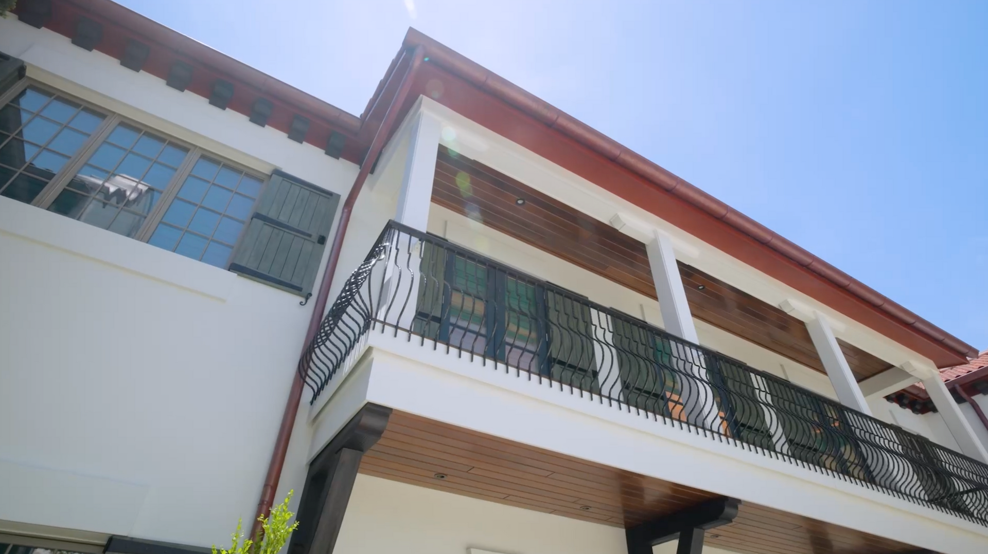 Below (scroll down) the wall niche for the sculpture; the iron banister on the stairs; the planters and their supporting brackets; and the safety rail around the balcony; all custom made by JCB craftsmen.